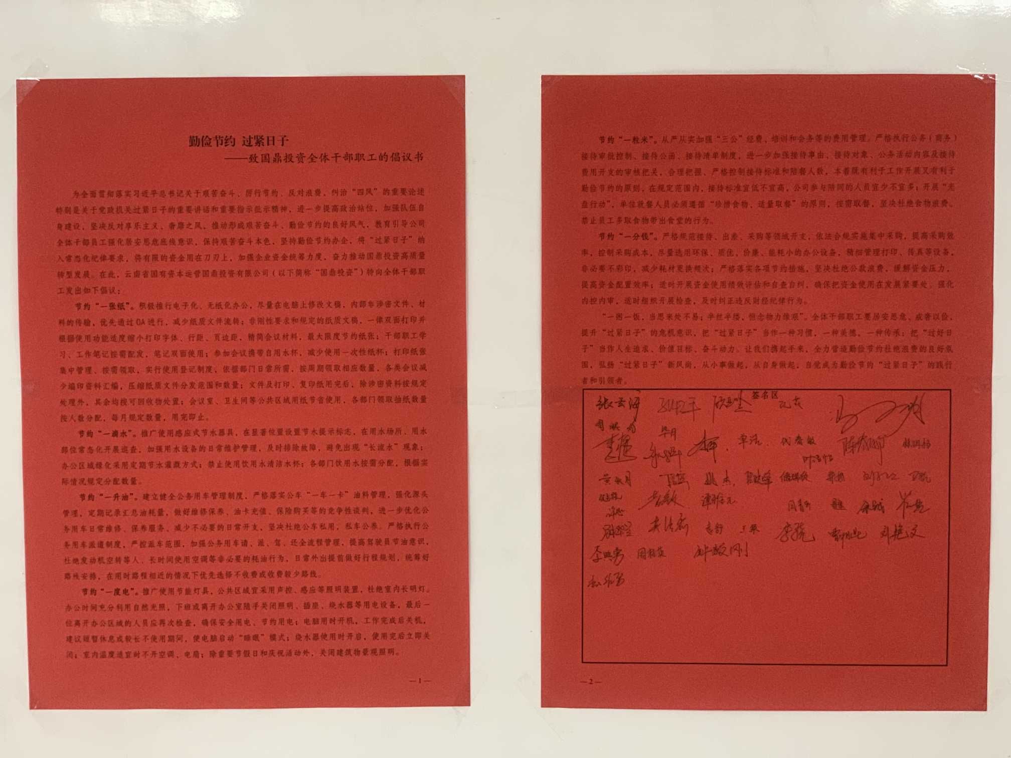 为全面贯彻落实习近平总书记关于艰苦奋斗、厉行节约、反对浪费、纠治“四风”的重要论述特别是关于党政机关过紧日子的重要讲话和重要指示批示精神,近期,云南国有资本所属云南省国有资本运营国鼎投资有限公司(以下简称“国鼎投资”)向全体干部职工宣发并组织签订倡议书。持续推进国鼎投资“过紧日子”专项行动稳步向前,推动全体干部职工进一步提高政治站位,加强队伍自身建设,坚决反对享乐主义、奢靡之风,推动形成艰苦奋斗、...