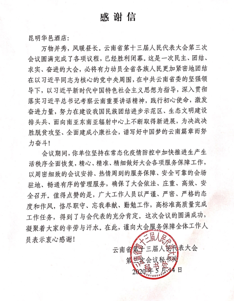 编者按】云南省第十三届人民代表大会第三次会议圆满完成各项议程,已胜利闭幕。会议期间,云南资本下属昆明华邑酒店,精心、精准、精细做好了大会各项服务保障工作,以周密细致的会议安排、热情周到的服务保障、安全可靠的会场驻地、畅通有序的管理服务,确保了大会依法、庄重、高效、安全召开。 日前,公司收到来自云南省第十三届人民代表大会第三次会议秘书处的《感谢信》,感谢我司华邑酒店员工恪尽职守、...