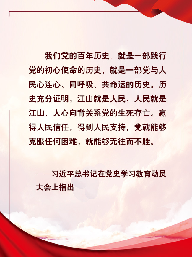 百年征程波澜壮阔,百年初心历久弥坚。站在“两个一百年”的历史交汇点上,更需要广大党员干部学史明理、学史增信、学史崇德、学史力行,从党史中汲取不竭的精神动力,始终坚持人民至上,紧紧依靠人民、不断造福人民、牢牢植根人民,与人民心心相印、与人民同甘共苦、与人民团结奋斗,与亿万人民一起奔向更美好的未来。(文字:刘跃江 海报:张倩)